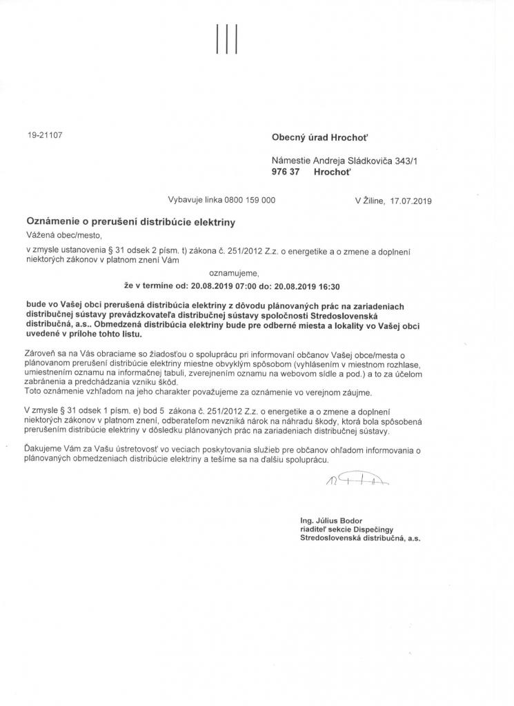 Oznámenie o prerušení distribúcie elektriny 1