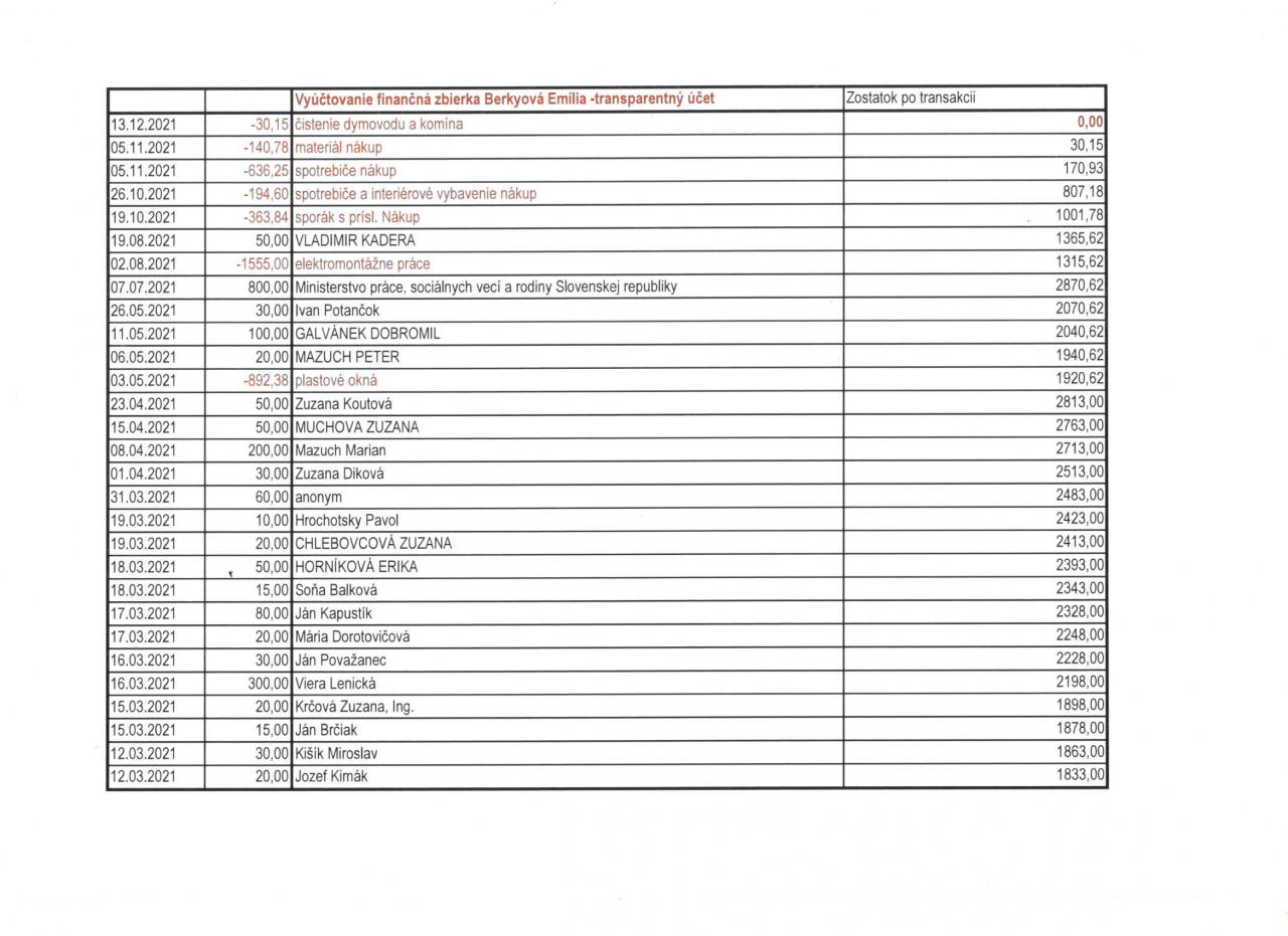 Záverečné vyúčtovanie dobrovoľnej zbierky s názvom "Finančná pomoc rodine Berkyovej po požiari rodinného domu"